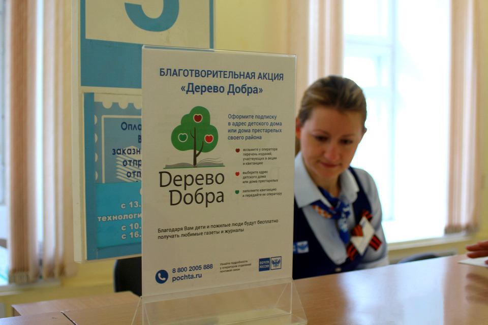 В 2021 г. жители Красноярского края активно участвовали в акции Почты России «Дерево добра» по благотворительной подписке в адрес социальных учреждений региона. В первом полугодии в детские дома и интернаты для ветеранов и инвалидов поступило свыше 1500 газет и журналов, оформленных благотворителями, во втором полугодии социальные учреждения будут получать более 1200 изданий.
