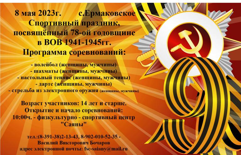 08 мая 2023 г., в физкультурно-спортивном центре "Саяны", пройдёт спортивный праздник посвящённый 78-й годовщине Победы в Великой Отечественной Войне 1941-1945 годов.