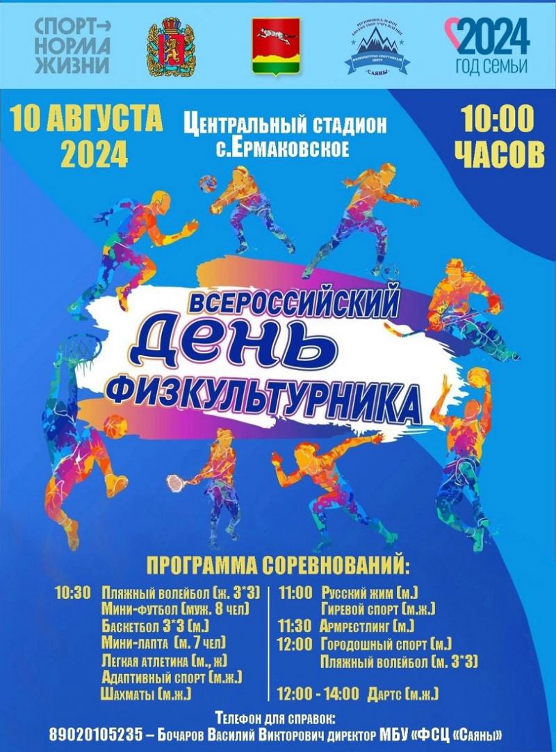10 августа 2024 г. МБУ "ФСЦ "Саяны" приглашает вас на спортивные состязания приуроченные к Всероссийскому дню физкультурника, Соревнования пройдут на центральном стадионе с. Ермаковское. Начало в 10:00 ч.