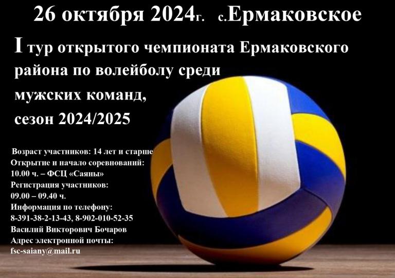 26 октября 2024 г. МБУ "ФСЦ "Саяны" приглашает вас на I-й тур открытого чемпионата Ермаковского района по волейболу среди мужских команд. Начало в 10:00 ч. Регистрация участников с 09:00 до 09:40 ч.