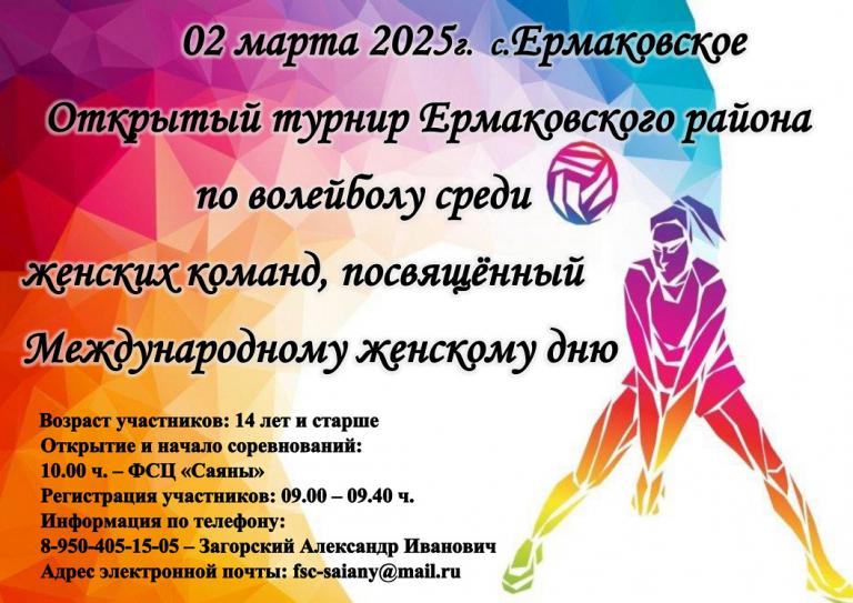 02.03.2025 г. ФСЦ "Саяны" приглашает Вас на Открытый турнир по волейболу среди женских команд.