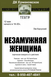 12 мая 2016 года в Ермаковском РДК лирическая комедия в 2-х действиях - "Незамужняя женщина". Начало в 18:30 часов.
