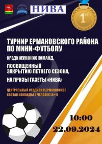 22 сентября 2024 г. МБУ "ФСЦ "Саяны" приглашает вас на Турнир Ермаковского района по мини-футболу. Турнир пройдёт в с. Ермаковское (центральный стадион). Начало в 10:00 ч.
