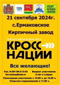 21 сентября 2024 г. МБУ "ФСЦ "Саяны" приглашает вас на спортивные состязания приуроченные к Всероссийскому дню бега «Кросс нации» Старт пройдёт в с. Ермаковское (в районе кирпичного завода). Начало в 11:00 ч. Регистрация участников с 10:00 до 10:50 ч.